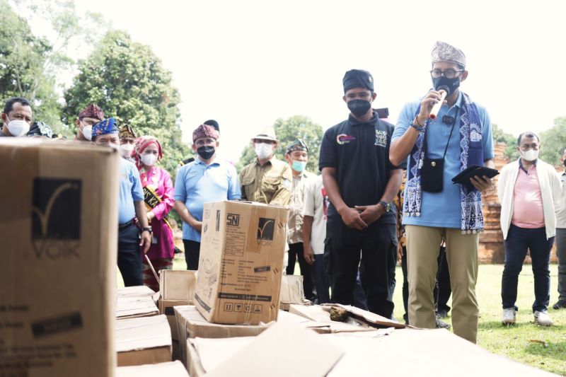Jakarta (ANTARA) – Menteri Pariwisata dan Ekonomi Kreatif (Menparekraf) Sandiaga Uno memberikan bantuan 10 kloset duduk untuk homestay saat berkunjung ke Desa Wisata Muara Jambi, Kecamatan Maro Sebo, Kabupaten Muaro Jambi.